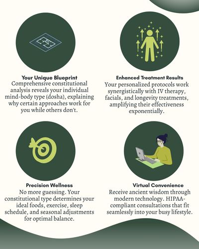 Discover your unique constitutional blueprint and unlock personalized wellness protocols that enhance every treatment you love. Ancient wisdom meets modern precision.